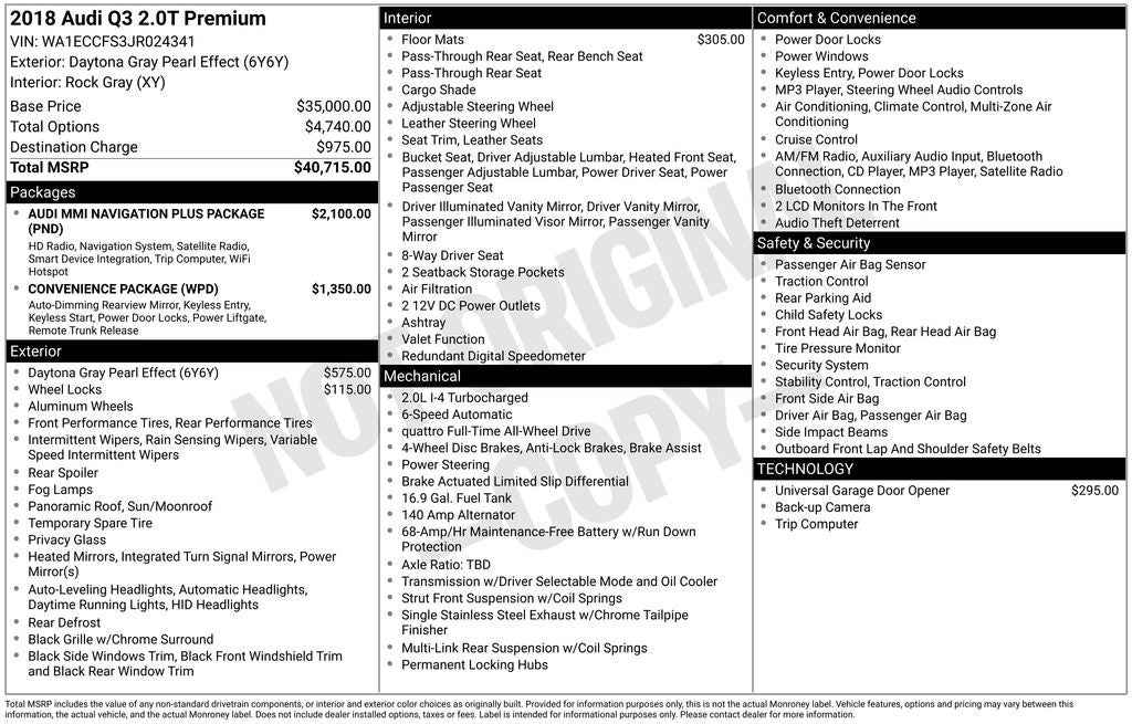 20/28 City/Highway MPG Here at Oliverio Auto, we try to make the purchase process as easy and hassle free as possible. We encourage you to experience this for yourself when you come to look at this terrific 2018 Audi Q3 loaded with options like Audi MMI Navigation Plus Package (Audi Connect w/Online Services and Audi MMI Navigation Plus), Convenience Package (Aluminum Satellite Inlays, Audi Advanced Key, Auto-Dimming Interior Mirror w/Compass, and Power Tailgate), Premium Plus Package (Audi Side Assist, Full LED Headlights & LED Taillights, Power Adjustable/Folding Heated Exterior Mirrors, and Stainless Steel Trunk Edge), 10 Speakers, Heated front seats, Power moonroof, Radio: Audi Concert System w/AM/FM Radio, Remote keyless entry, Steering wheel mounted audio controls, Wheels: 18 5-Arm Turbine Design, 3-Step Heated Front Bucket Seats, 4-Wheel Disc Brakes, ABS brakes, Air Conditioning, Alloy wheels, AM/FM radio: SiriusXM, Audi Guard Protection Kit, Audi Guard Wheel Lock Kit, Automatic temperature control, Axle Ratio: TBD, Black HomeLink, Brake assist, Bumpers: body-color, CD player, Delay-off headlights, Driver door bin, Driver vanity mirror, Dual front impact airbags, Dual front side impact airbags, Electronic Stability Control, Exterior Parking Camera Rear, Four wheel independent suspension, Front anti-roll bar, Front Bucket Seats, Front Center Armrest, Front dual zone A/C, Front fog lights, Front reading lights, Fully automatic headlights, Heated door mirrors, High intensity discharge headlights: Xenon plus, Illuminated entry, Leather Seating Surfaces, Leather Shift Knob, Leather steering wheel, Low tire pressure warning, Occupant sensing airbag, Outside temperature display, Overhead airbag, Overhead console, Panic alarm, Passenger door bin, Passenger vanity mirror, Power door mirrors, Power driver seat, Power passenger seat, Power steering, Power windows, Radio data system, Rain sensing wipers, Rear anti-roll bar, Rear fog lights, Rear reading lights, Rear seat center armrest, Rear window defroster, Rear window wiper, Roof rack: rails only, Security system, Speed control, Speed-sensing steering, Split folding rear seat, Spoiler, Tachometer, Telescoping steering wheel, Tilt steering wheel, Traction control, Trip computer, Turn signal indicator mirrors, and Variably intermittent wipers!