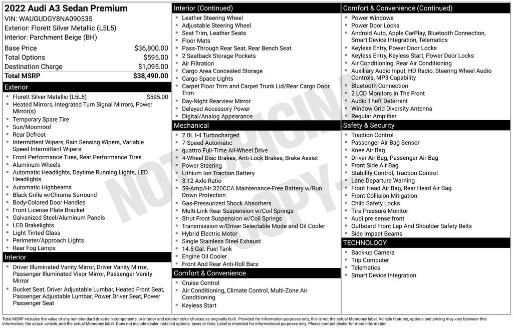 28/36 City/Highway MPG Here at Oliverio Auto, we try to make the purchase process as easy and hassle free as possible. We encourage you to experience this for yourself when you come to look at this gorgeous-looking 2022 Audi A3 loaded with options like Alloy wheels, Brake assist, Electronic Stability Control, Exterior Parking Camera Rear, Heated Front Bucket Seats, Heated front seats, Leather Seating Surfaces, Power moonroof, Radio: Audi Sound System, Rain sensing wipers, Remote keyless entry, Steering wheel mounted audio controls, Telescoping steering wheel, Tilt steering wheel, 4-Wheel Disc Brakes, 6 Speakers, ABS brakes, Air Conditioning, AM/FM radio, Audi Guard All-Weather Floor Mats, Auto High-beam Headlights, Automatic temperature control, Bumpers: body-color, Delay-off headlights, Driver door bin, Driver vanity mirror, Dual front impact airbags, Dual front side impact airbags, Emergency communication system, Four wheel independent suspension, Front anti-roll bar, Front Bucket Seats, Front Center Armrest, Front dual zone A/C, Front reading lights, Fully automatic headlights, Heated door mirrors, Illuminated entry, Knee airbag, Leather steering wheel, Low tire pressure warning, Occupant sensing airbag, Outside temperature display, Overhead airbag, Overhead console, Panic alarm, Passenger door bin, Passenger vanity mirror, Power door mirrors, Power driver seat, Power passenger seat, Power steering, Power windows, Radio data system, Rear air conditioning, Rear anti-roll bar, Rear fog lights, Rear reading lights, Rear seat center armrest, Rear window defroster, Speed control, Speed-sensing steering, Speed-Sensitive Wipers, Split folding rear seat, Tachometer, Traction control, Trip computer, Turn signal indicator mirrors, Variably intermittent wipers, and Wheels: 17 5-Arm Design!