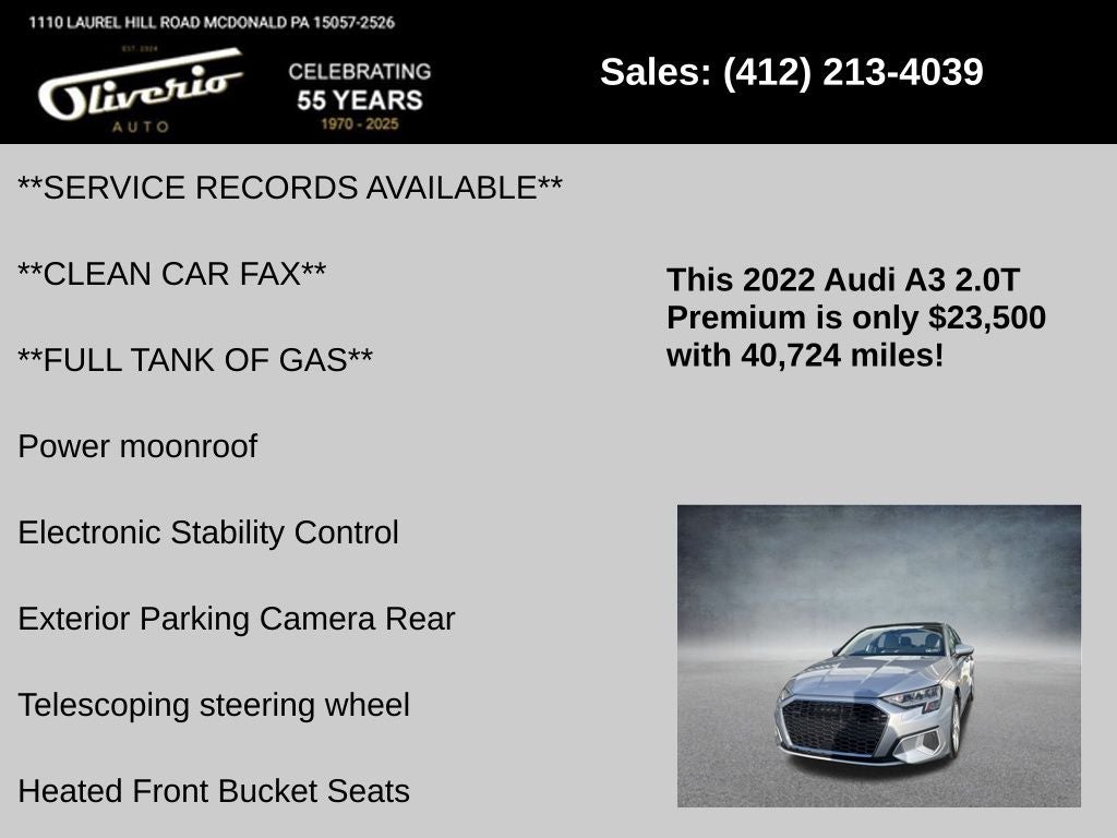 28/36 City/Highway MPG Here at Oliverio Auto, we try to make the purchase process as easy and hassle free as possible. We encourage you to experience this for yourself when you come to look at this good-looking 2022 Audi A3 loaded with options like 4-Wheel Disc Brakes, 6 Speakers, ABS brakes, Air Conditioning, Alloy wheels, AM/FM radio, Audi Guard All-Weather Floor Mats, Auto High-beam Headlights, Automatic temperature control, Brake assist, Bumpers: body-color, Delay-off headlights, Driver door bin, Driver vanity mirror, Dual front impact airbags, Dual front side impact airbags, Electronic Stability Control, Emergency communication system, Exterior Parking Camera Rear, Four wheel independent suspension, Front anti-roll bar, Front Bucket Seats, Front Center Armrest, Front dual zone A/C, Front reading lights, Fully automatic headlights, Heated door mirrors, Heated Front Bucket Seats, Heated front seats, Illuminated entry, Knee airbag, Leather Seating Surfaces, Leather steering wheel, Low tire pressure warning, Occupant sensing airbag, Outside temperature display, Overhead airbag, Overhead console, Panic alarm, Passenger door bin, Passenger vanity mirror, Power door mirrors, Power driver seat, Power moonroof, Power passenger seat, Power steering, Power windows, Radio data system, Radio: Audi Sound System, Rain sensing wipers, Rear air conditioning, Rear anti-roll bar, Rear fog lights, Rear reading lights, Rear seat center armrest, Rear window defroster, Remote keyless entry, Speed control, Speed-sensing steering, Speed-Sensitive Wipers, Split folding rear seat, Steering wheel mounted audio controls, Tachometer, Telescoping steering wheel, Tilt steering wheel, Traction control, Trip computer, Turn signal indicator mirrors, Variably intermittent wipers, and Wheels: 17 5-Arm Design!