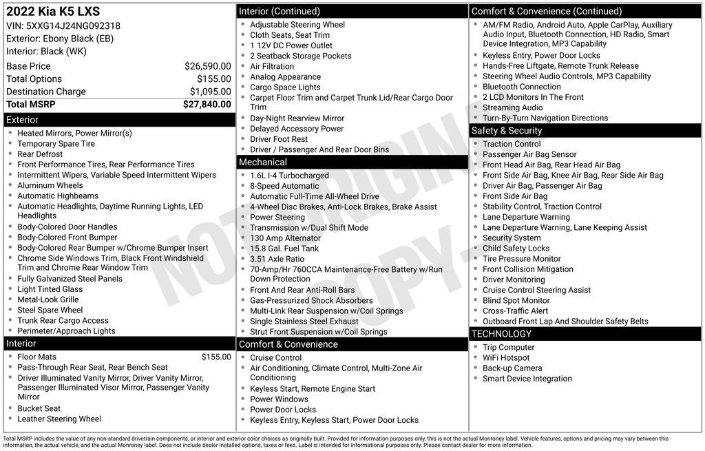 Ebony Black 2022 Kia K5 LXS AWD 8-Speed Automatic I4 Odometer is 25372 miles below market average!