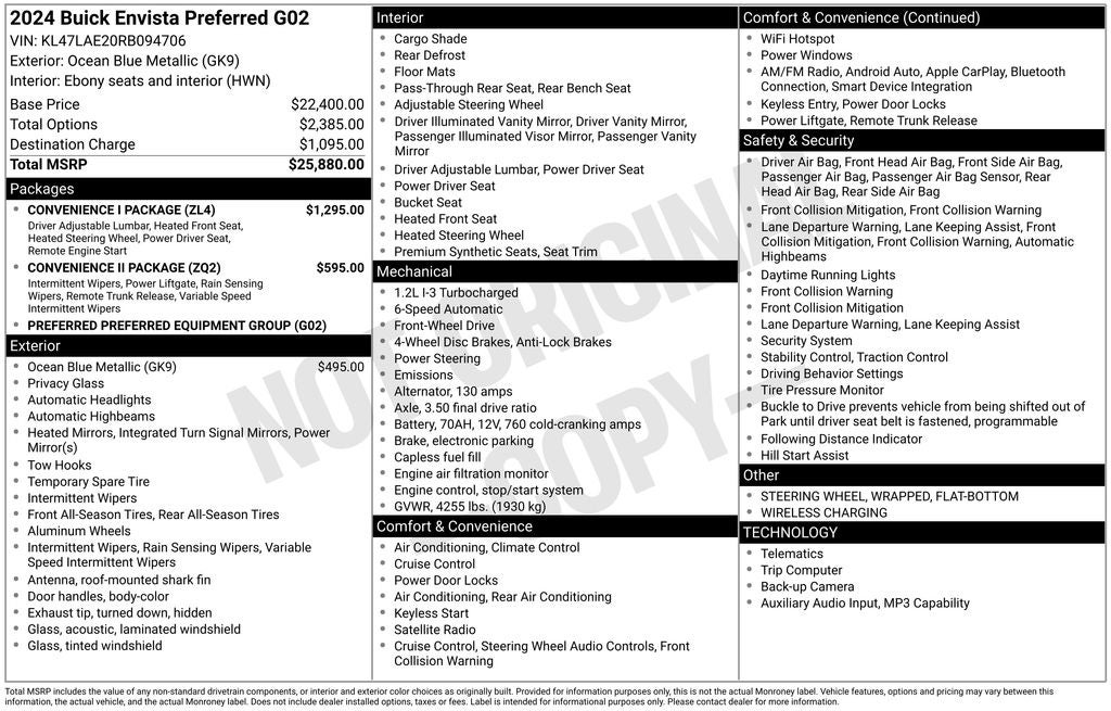 28/32 City/Highway MPG Here at Oliverio Auto, we try to make the purchase process as easy and hassle free as possible. We encourage you to experience this for yourself when you come to look at this superb 2024 Buick Envista loaded with options like Convenience I Package (2-Way Power Driver Lumbar Control, 8-Way Power Driver Seat Adjuster, Flat-Bottom Wrapped Steering Wheel, Front Doors Keyless Open, Heated Driver & Front Passenger Seats, Heated Steering Wheel, and Remote Vehicle Starter System), Convenience II Package (Front Intermittent Rainsense Wipers, Power Liftgate, and Wireless Charging), Preferred Equipment Group G02, 2 USB Ports (1 Type-A, 1 Type-C), 3.50 Final Drive Axle Ratio, 4-Way Manual Passenger Seat Adjuster, 4-Wheel Disc Brakes, 6 Speakers, 6-Way Manual Driver Seat Adjuster, ABS brakes, Air Conditioning, Alloy wheels, AM/FM radio: SiriusXM, Auto High-beam Headlights, Automatic temperature control, Brake assist, Bumpers: body-color, Cloth w/Leatherette Seat Trim, Compass, Delay-off headlights, Driver door bin, Driver vanity mirror, Dual front impact airbags, Dual front side impact airbags, Electronic Stability Control, Emergency communication system: OnStar, Exterior Parking Camera Rear, Front anti-roll bar, Front Bucket Seats, Front Center Armrest, Front reading lights, Front wheel independent suspension, Fully automatic headlights, Heated door mirrors, Illuminated entry, Low tire pressure warning, Occupant sensing airbag, Outside temperature display, Overhead airbag, Overhead console, Panic alarm, Passenger door bin, Passenger vanity mirror, Power door mirrors, Power steering, Power windows, Premium 6-Speaker Audio System Feature, Radio data system, Radio: AM/FM Stereo Audio System, Rear window defroster, Remote keyless entry, Security system, SiriusXM, Speed control, Split folding rear seat, Steering wheel mounted audio controls, Tachometer, Telescoping steering wheel, Tilt steering wheel, Traction control, Trip computer, Turn signal indicator mirrors, Variably intermittent wipers, Wheels: 17 Bright Silver Painted Aluminum, and Wireless Apple CarPlay/Wireless Android Auto!
