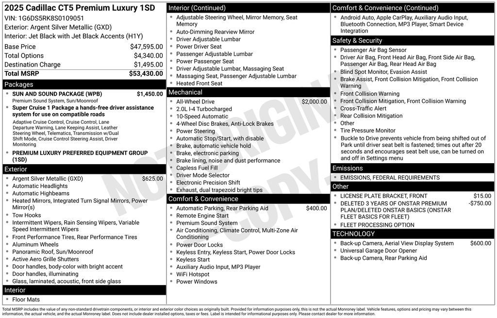 22/30 City/Highway MPG Here at Oliverio Auto, we try to make the purchase process as easy and hassle free as possible. We encourage you to experience this for yourself when you come to look at this handsome-looking 2025 Cadillac CT5 loaded with options like Preferred Equipment Group 1SD (LED Reflective Windshield Collision Alert), Sun & Sound Package (UltraView Dual Pane Sunroof), 8-Way Power Driver Seat Adjuster, 8-Way Power Front Passenger Seat Adjuster, AKG 15-Speaker System, Apple CarPlay/Android Auto, Auto High-beam Headlights, Brake assist, Electronic Stability Control, Enhanced Automatic Parking Assist, Memory seat, Navigation System, Radio: Google Built-In Infotainment Experience, SiriusXM w/360L Trial Subscription, Speed control, UltraView Dual Pane Sunroof (DISC), 15 Speakers, 4-Wheel Disc Brakes, ABS brakes, Air Conditioning, Alloy wheels, AM/FM radio: SiriusXM with 360L, Auto-dimming door mirrors, Auto-dimming Rear-View mirror, Automatic Stop/Start w/Disable, Automatic temperature control, Bumpers: body-color, Compass, Delay-off headlights, Deleted 3 Years of OnStar Digital Services, Driver 4-Way Power Lumbar Seat Adjuster, Driver door bin, Driver Power Lumbar Massage Seat, Driver Power Seatback Bolster Adjustment, Driver vanity mirror, Dual front impact airbags, Dual front side impact airbags, Emergency communication system: OnStar and Cadillac connected services capable, Four wheel independent suspension, Front anti-roll bar, Front Bucket Seats, Front Center Armrest, Front dual zone A/C, Front License Plate Bracket, Front Passenger 4-Way Power Lumbar Seat Adjuster, Front Passenger Power Lumbar Massage Seat, Front Passenger Power Seatback Bolster Adjustment, Front reading lights, Fully automatic headlights, Garage door transmitter, HD Surround Vision, Heated door mirrors, Heated Driver & Front Passenger Seats, Heated front seats, Heated steering wheel, Illuminated entry, Knee airbag, Leather Seating Surfaces w/Mini-Perforated Inserts, Leather steering wheel, Low tire pressure warning, Occupant sensing airbag, Outside temperature display, Overhead airbag, Overhead console, Panic alarm, Passenger door bin, Passenger vanity mirror, Power door mirrors, Power driver seat, Power passenger seat, Power steering, Power windows, Radio data system, Rain sensing wipers, Rear anti-roll bar, Rear reading lights, Rear seat center armrest, Rear window defroster, Remote keyless entry, Speed-sensing steering, Split folding rear seat, Steering wheel memory, Steering wheel mounted audio controls, Tachometer, Telescoping steering wheel, Tilt steering wheel, Traction control, Trip computer, Turn signal indicator mirrors, Variably intermittent wipers, Ventilated Driver & Front Passenger Seats, Ventilated front seats, Voltmeter, and Wheels: 18 Premium Painted Alloy!